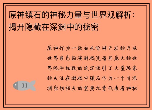 文章摘要:基于炼金提取器的技术创新与应用前景分析,旨在探讨这一新兴技术如何推动行业发展,并展望其在不同领域中的应用潜力。炼金提取器作为一种新型的提取工具,通过多重创新的技术手段,提高了资源提取的效率与精度。本文将从技术创新、行业应用、市场前景及挑战等方面,详细阐述炼金提取器在现代工业中的重要性,并分...